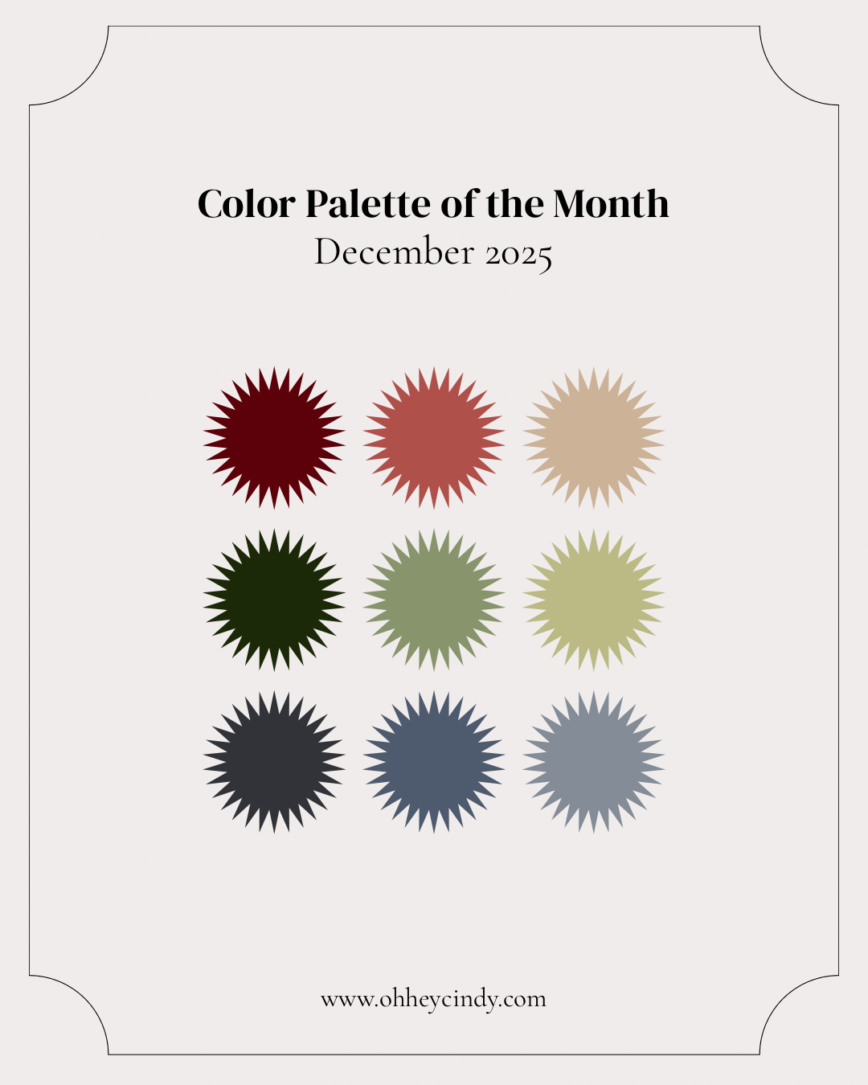 This month’s color palette feels like a quiet celebration of depth and nostalgia. Think heirloom velvet, faded frescoes, and the patina of time-worn treasures. Each shade carries a story—muted pinks and deep reds echo vintage textiles, while olive greens and slate blues whisper of old-world gardens and misty winter skies.
